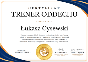 Jestem Trenerem Oddechu certyfikowanym w Szkole Oddechu Mariusza Mroza, uczniem Dana Brule (twórcy Mastering The Breath).